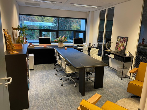 De zeer solide en prachtig vormgegeven bureautafel is 275 breed, 90 cm diep en 75 cm hoog. Hij is 10 jaar geleden gekocht bij de firma Co van der Horst te Amstelveen, zie factuur. Er zitten wat gebruikssporen aan de bovenzijde van de tafel.