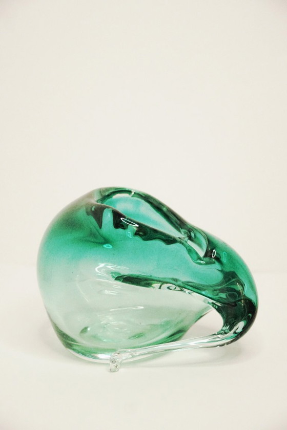 Verfraai uw interieur met dit prachtige, handgeblazen kunstglazen object. Deze organisch gevormde schaal, uitgevoerd in een levendige, diepe smaragdgroene kleur, toont het meesterschap van traditioneel glasblazen. Dankzij het aanzienlijke gewicht en de hoogglansafwerking is het een perfecte blikvanger voor op een salontafel, een stijlvolle asbak of een opvallend sculpturaal element in een modern of vintage interieur.