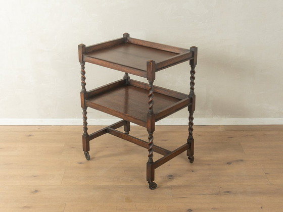 Prachtige theewagen in Jacobethaanse stijl uit de jaren 20. Hoogwaardige corpus van massief eikenhout met vier gedraaide "gerstesuiker" poten (gedraaide spiraalpoten) verbonden door rechthoekige spijlen. Groot-Brittannië. Goede staat met lichte gebruikssporen.