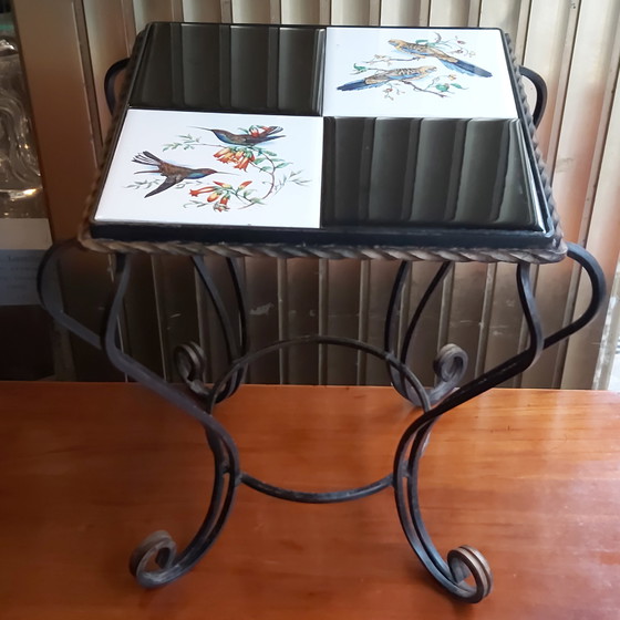 Prachtige vintage plantenstand, smeedijzer en keramiek met vogelmotief