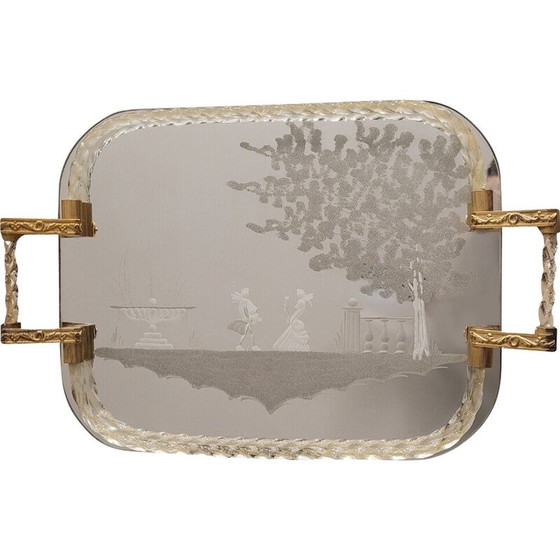 Prachtig tafeltje of dienblad van Murano-glas en goudstof, in de jaren 1950 in Italië. Het rechthoekige lichaam is een spiegel met afgeronde hoeken, gesneden uit een stenen wiel om een hofscène voor te stellen. Deze scène toont een echtpaar gekleed in elegante kleding, in een ordelijke tuin met classicistische architecturale elementen die een compleet en realistisch beeld creëren. De hele omtrek van de spiegel is versierd met een op zichzelf gewikkeld glazen koord met goudstof erin. Aan de twee kortere zijden bevinden zich twee prachtige handgrepen, gemaakt van verguld brons en verguld kristallen krullen. Aan de achterkant beschermt een houten deksel het geheel.