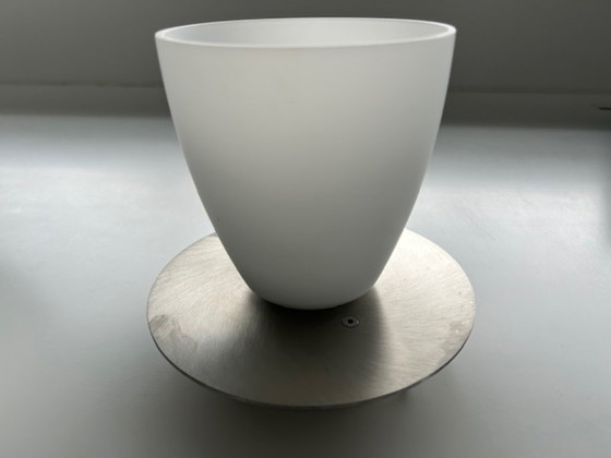 De iKE is een ontwerp uit 1998 van Mario Mengotti voor het Italiaanse merk Prandina. De lamp is erg geschikt om in verlaagd plafond te worden geplaatst voor de verlichting van de omgeving in combinatie met de aanstralen van een werkblad. Gedacht kan worden aan een wastefelmeubel of kast met werktafel. Wel wat opvallender en authentieker dan het obligate inbouwspotje. Aan een melkwitte glazen kap is een voet van roestvrij staal bevestigd waarin ook plafondplaat is opgenomen. De lamp is voorzien van een E27-fitting waarvoor een groot assortiment aan lichtbronnen, natuurlijk in led en in diverse modellen en vermogens beschikbaar zijn. De lamp verkeert in uitstekende staat, heeft een diameter van 16 cm en een hoogte van 36 cm.