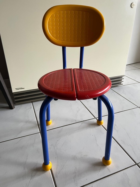 Betreed de speelse wereld van het design uit de jaren 80 met deze Puzzle kinderstoel van IKEA, ontworpen door de gerenommeerde designers Knut & Marianne Hagberg. Dit meubelstuk belichaamt de levendige Memphis-stijl, gekenmerkt door zijn gedurfde primaire kleuren en speelse vormen, waardoor het een prachtige aanwinst is voor elke kinderkamer of verzamelruimte.