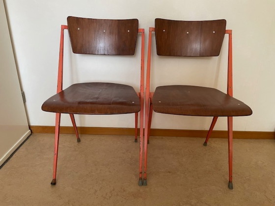 De zitting en rugleuning zijn van bruin multiplex. Het frame is rood gepoedercoat. Deze kleur is zeldzaam komt ook af en toe voor bij de Revolt stoel van deze fabrikant.