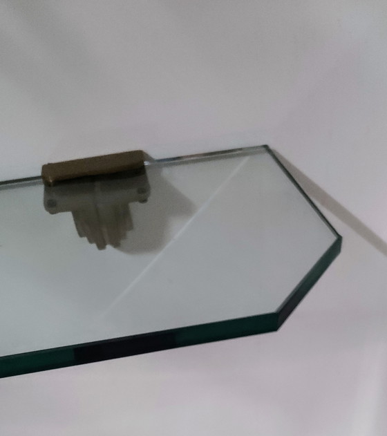 Deze door een bekende ontwerper uit de jaren 70 die veel met gegoten brons en glas werkte is dit de zeldzame 'R07 Pioneer Series' planken uit 1970 zijn een prachtig voorbeeld van mid-century modern design. De plank is gemaakt van hoogwaardig glas en wordt ondersteund door stevige messing beugels. Ze bieden een elegante en minimalistische uitstraling, perfect voor het tentoonstellen van decoratieve objecten of boeken. De combinatie van glas en messing geeft een luxe en tijdloze uitstraling aan elke ruimte.
