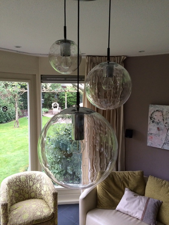 Raak Amsterdam - Hanglamp, Kroonluchter, Plafondlamp, drievoudige Globe druppel bollen uit de jaren 60. Nederlands fabricaat. Zeldzame mond geblazen heldere bollen met druppel motief (globe lampen) en verchroomde armatuur. Met originele Raak plafondplaat. Nieuwe bekabeling en gereviseerde armaturen. Hoogte van de bollen kunnen worden aangepast. 1x Model B 1224 (diameter 18 cm ) gat 8 cm 1x Model B 1226 (diameter 24 cm) gat 8 cm 1x Model B 1228 (diameter 35 cm) gat 12 cm