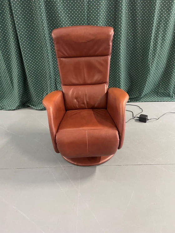 Ervaar ultiem comfort met deze stijlvolle relaxfauteuil, bekleed met hoogwaardig roodbruin leer. De fauteuil is voorzien van een elektrische bediening, waardoor u moeiteloos de ideale zitpositie kunt vinden. Het leer op het zitvlak en de armleuningen is in uitstekende staat, terwijl de ronde voet een elegante uitstraling geeft.