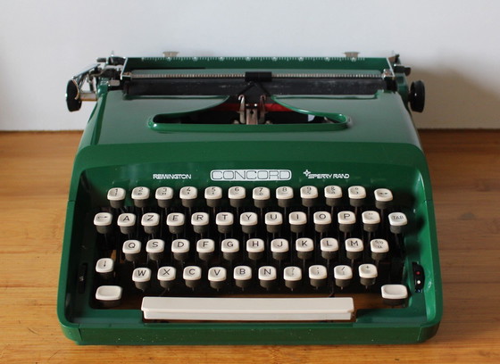 Groene Remington Concord Sperry Rand typemachine, model 1969. Hij werkt perfect (het lint is vervangen). De koffer wordt meegeleverd, maar een van de scharnieren is gebroken (zie foto). Toch is het handig om de machine in op te bergen.