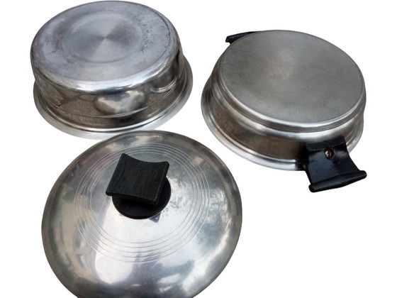 Allemaal in uitstekende staat, met een paar normale, onopvallende krasjes door slijtage. De stoofpotten hebben sporen van gaskoken, die kunnen worden verwijderd met een beetje witte azijn of citroen.