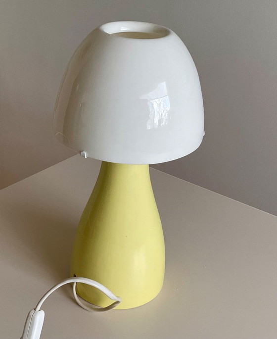Deze charmante retro paddenstoel lamp van IKEA voegt een vleugje nostalgie toe aan uw interieur. Met zijn opvallende gele voet en witte kap, straalt deze lamp een warme en uitnodigende gloed uit die perfect is voor elke kamer.