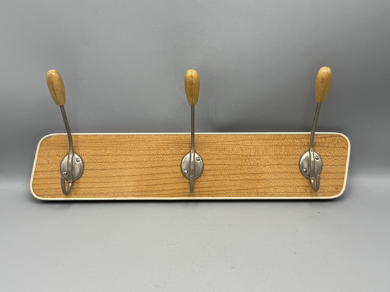 Breng een vleugje vintage elegantie in je interieur met dit charmante mid-century kapstokje. Het ontwerp combineert een warme houten basis met drie metalen haken, afgewerkt met houten details aan de bovenzijde. Een tijdloos design dat perfect past in zowel een retro als modern interieur.