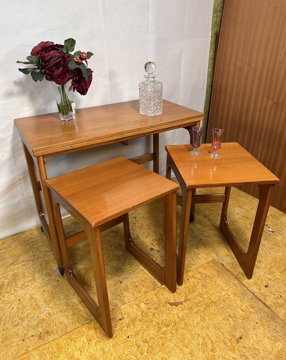 Een mid-century tristor teakhouten salontafel ontworpen door mcintosh. De tafel kan worden gedraaid en uitgeklapt en heeft twee nesttafels. Mcintosh is een trotse Schotse meubelfabrikant, opgericht door alexander henry mcintosh in 1869 in de kustplaats kirkcaldy, fife. Het ethos van het bedrijf is gebaseerd op kwaliteitsproducten gemaakt door hoogopgeleide lokale ambachtslieden. Hierdoor ontstond een reputatie die hen internationale erkenning opleverde tijdens hun tentoonstellingen op de wereldtentoonstelling van 1878 in Parijs en de tentoonstelling van 1879 in Sydney. Na de Tweede Wereldoorlog omarmde Mcintosh, net als veel van zijn tijdgenoten, het moderne en scandinavische design van de jaren 2000 met strakke lijnen en organische, sculpturale elementen in hun meubilair. Mcintosh staat tot op de dag van vandaag bekend om hun kwaliteitsmeubelen, vooral dressoirs, waarvan het dunvegan dressoir, ontworpen door tom robertson in de jaren 1960, het populairst is.