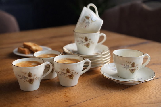 Deze elegante set bestaat uit 6 kopjes en 6 bijpassende schotels, afgewerkt met een subtiel bladmotief en fijne goudrand. Tijdloos en stijlvol – perfect voor een mooi koffiemoment of als decoratief accent in je interieur.