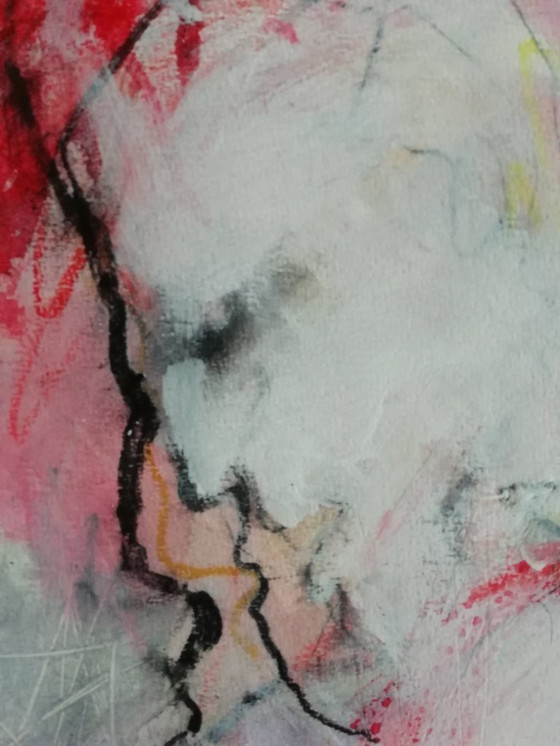 Ontdek de intrigerende abstracte wereld van 'In Mind' door Rob Jacobs. Dit kunstwerk, met zijn levendige rode en subtiele roze tinten, nodigt uit tot interpretatie en reflectie. De zwarte lijnen en witte accenten creëren een dynamisch contrast dat de aandacht trekt en vasthoudt.
