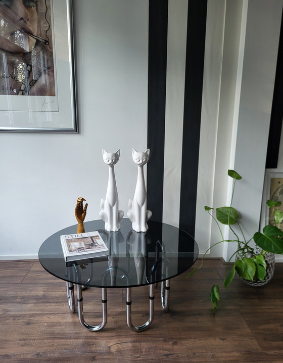 Prachtige coffeetable van Roberto Gabetti & Aimaro Isola jaren '70. Buizen frame van metaal RVS met een ronde rookglazen tafelblad. Glazenblad is helemaal gaaf. Afmetingen: 39 (H) x 90 (D) cm. Onderstel: 38 (H) x 55 (D) cm. Materiaal: RVS en glas. Kleur: zilver en rookglas.