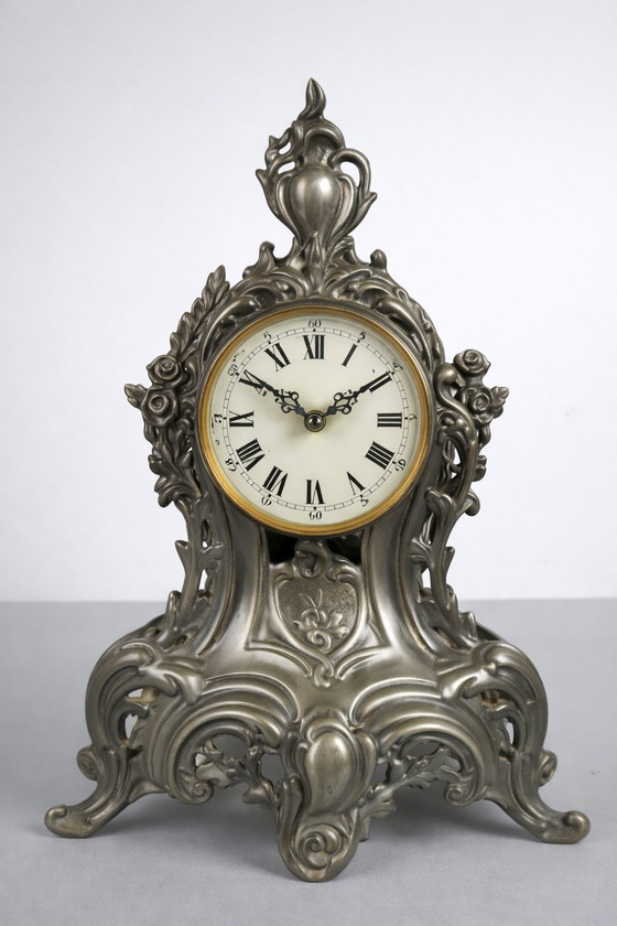 Deze elegante tafelklok heeft een rijkelijk versierde metalen behuizing in uitgesproken rococo-stijl, met sierlijke krullen, florale motieven en rozenornamenten. De sculpturale vorm en opengewerkte details geven de klok een luxueuze, klassieke uitstraling die perfect past in een stijlvol interieur.