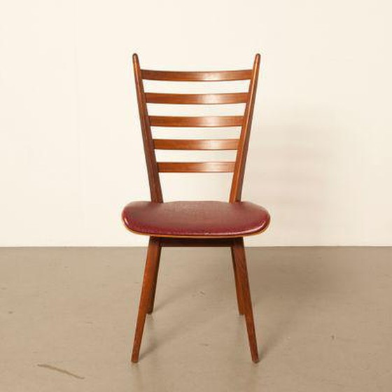 Stoom-vormige multiplex zitting met kunstleer. Komt uit periode tussen eind jaren vijftig en begin jaren zestig. Eén stoel heeft een klein scheurtje (zie foto).