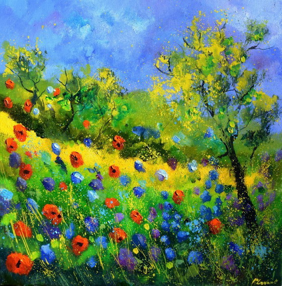 Ontdek een fascinerend kunstwerk dat de tijdloze schoonheid van de natuur oproept. "Red Poppies 77" is een impressionistisch schilderij dat de levendigheid van een veld met rode klaprozen, met hier en daar blauwe en gele accenten, onder een schitterende azuurblauwe hemel vastlegt.