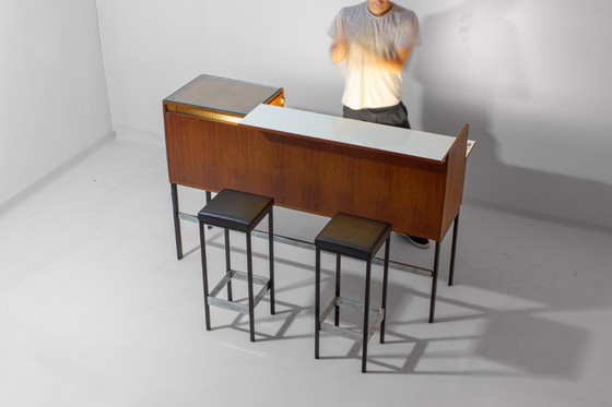 Deze verlichte cocktailbar werd in de jaren 60 ontworpen door de Belgische ontwerper Roger De Winter. Het meubel is gemaakt van teakhout met een zwart metalen frame en heeft een ingebouwde lamp die door een gepatroneerd scherm aan de achterkant schijnt en een warme gloed creëert tijdens gebruik. De binnenkant is voorzien van een opbergvak met een uitneembare witte container, geschikt voor flessen of ijs, en andere opbergruimte. Het bovenblad combineert hout en glas, wat zorgt voor een strakke en praktische werkplek.