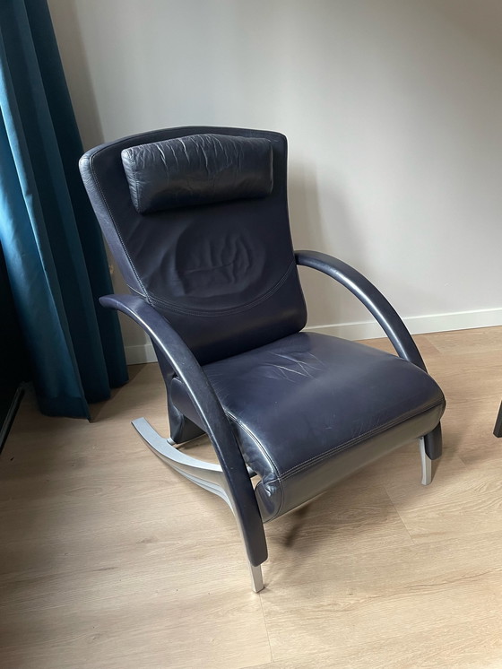 Comfortabele donkerblauwe leren Rolf Benz relaxfauteuil met aluminium onderstel in prima staat. Stoel kan gekanteld worden in de ligstand.
