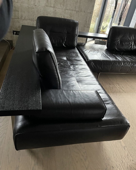 Strakke lijnen, hoog zitcomfort en een doordacht ontwerp: deze Rolf Benz Dono Lounge hoekbank is een echte eyecatcher. Bekleed met hoogwaardig bruin Montana leder en voorzien van een stevig rvs frame met rondom een geïntegreerde legplank in zwart gebeitst eikenfineer, biedt deze bank zowel stijl als functionaliteit.