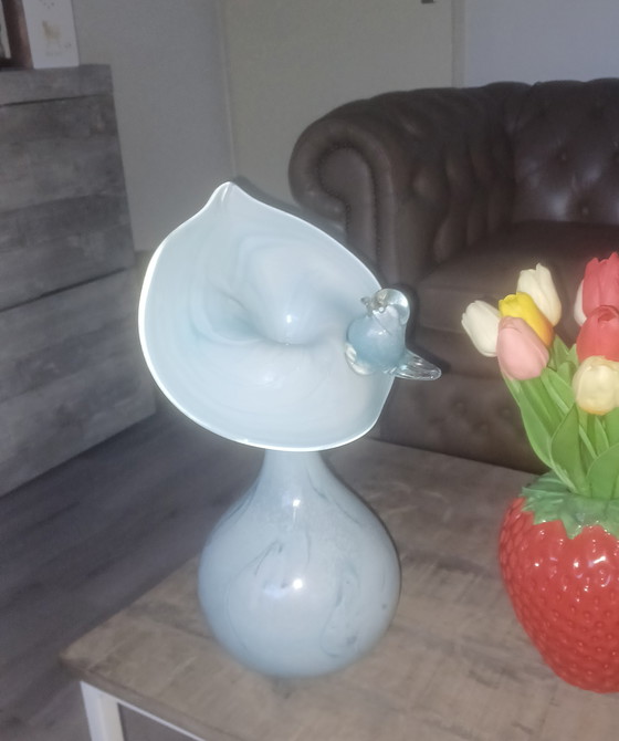 Deze prachtige vaas van Römische Glashutte uit Linz, Duitsland, is een meesterwerk van glasblazerskunst. Met een hoogte van 39 cm trekt deze vaas onmiddellijk de aandacht door zijn elegante vorm en de delicate vogel die sierlijk op de rand zit. De zachte blauwe tinten en de vloeiende lijnen geven de vaas een serene uitstraling, perfect voor een verfijnde interieurstijl.