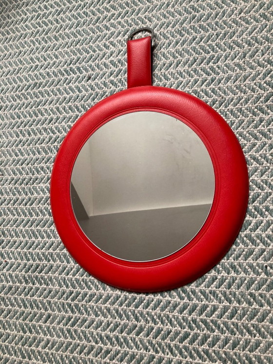 Een echte blikvanger: een wandspiegel uit de jaren 60/70, ingelijst in rood imitatieleer. Hij hangt op aan het metalen oogje dat aan de rode imitatieleren lus bevestigd is.