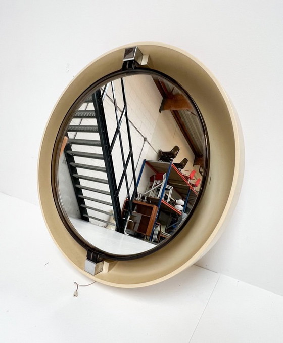 Geliefd bij de échte liefhebbers van vintage! Crèmekleurige kunststof designspiegel met diffuus back light van Specchio Allibert, 1970’s. De spiegel heeft een diameter van 61 cm, is kantelbaar en het licht kan aan-/uitgezet worden met het trekkoordje. Boven op de spiegel zit een electrapunt. Achter de spiegel zitten 4x E14 fittingen (ex. lampenbollen). De spiegel is eenvoudig en stevig op te hangen middels de diverse ophangpunten aan de achterzijde.