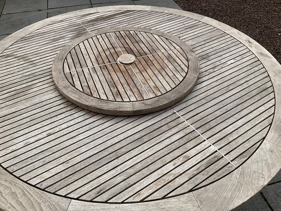 Deze teak houten equinox tuintafel met rvs poten, is destijds bij v.d. Kerkhof in Laren gekocht voor 2500 euro.