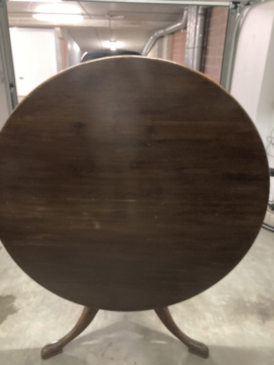 Dit is een klassieke ronde mahonie eettafel met een diameter van 120 cm. Hij heeft een stevig voetstuk en een rijke bruine afwerking, waardoor het een tijdloos stuk is voor elke eetkamer. Het elegante ontwerp van de tafel is perfect voor zowel een traditionele als een hedendaagse omgeving.