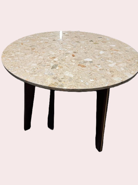 Te koop: prachtige ronde eettafel met luxe natuursteen blad (terrazzo/marmer) en massief houten walnoot poten in kruisbasis.