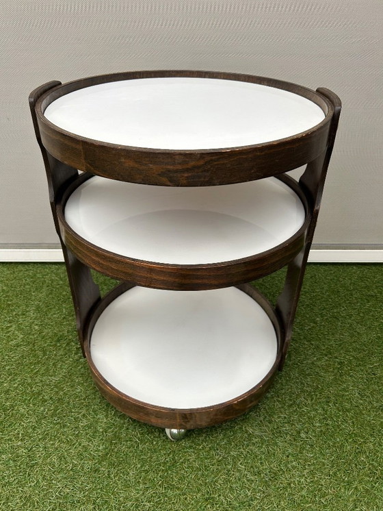 Deze slimme serveerwagen of bijzettafel, gemaakt van donkerbruin multiplex en voorzien van 3 formica bladen, verkeert in zeer goede staat en alle vier de wielen draaien nog prima.