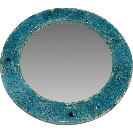 Ronde decoratieve spiegel van blauwachtig glas. Frans werk. Circa 1970