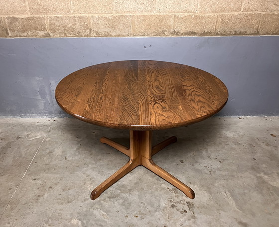 Vintage ronde tafel met massief eiken blad. Het mooi gevormde onderstel en het blad met typerende houttekening en kleur geven het item een sterk karakter. De afgeronde vormen maken dragen daar ook aan bij. In de poten zitten stelvoetjes voor een altijd stabiele tafel. Diameter 118 H 75 Dikte blad 3 cm