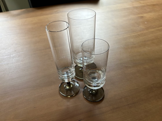 Dit vintage glasservies bestaat uit 12 sets van 3 glazen (bubbels, wijn en water/bier). Wij hebben deze glazen cadeau gekregen in 1986 maar eigenlijk nooit gebruikt. Dus ze zijn nog als nieuw. Helaas heeft 1 wijnglas deze 40 jaar niet overleefd. Dus in totaal 35 glazen.
