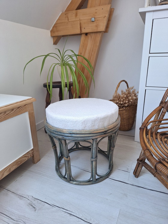 Antieke rotan poef uit de jaren 70 en bijbehorend kussen in ecru bouclette stof op maat gemaakt. Nieuw handgemaakt kussen in schuim en meubelstof. Afmetingen: Hoogte met kussen: 39,5 cm Diameter: 44,5 cm Dikte kussen: 10 cm Zorgvuldige levering.