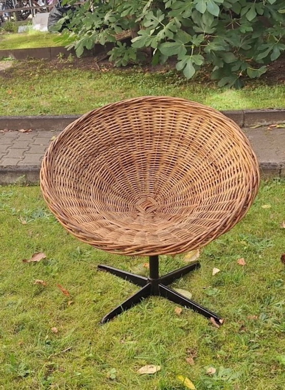 Rotan loungestoel uit de jaren 60, geschikt als cocktail- of terrasstoel, op een ijzeren onderstel. Bijzonder is dat de stoel 360 graden kan draaien.