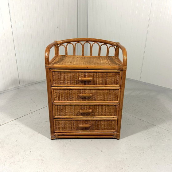 Rotan frame, spaanplaat bekleed met rieten laden, bovenkant en zijkanten, houten handgrepen.