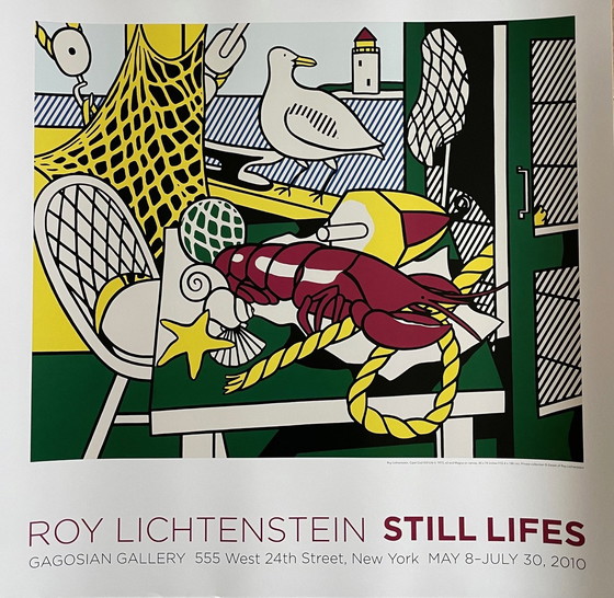 Roy Lichtenstein - "Cape Cod Still Life II" (1973) Poster. Gemaakt voor de Gagosian, New York tentoonstelling Roy Lichtenstein: Still Lifes, die zijn stillevens uit de jaren 1970 tot 1980 toonde. Met levendige kleuren, platte vormen en de kenmerkende Benday-stippen belichaamt dit werk Lichtensteins pop-art herinterpretatie van klassieke motieven. In goede staat, nooit ingelijst, met een kleine vouw in de rechterbovenhoek, die zal worden bedekt wanneer het wordt ingelijst.