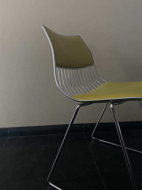 Ervaar de verfijnde elegantie van de Rudi Verelst stoel, ontworpen voor Novalux. Deze moderne stoel combineert een strak metalen frame met een levendige zeldzame geelgroene zitting, waardoor hij een opvallende toevoeging is aan elk interieur.