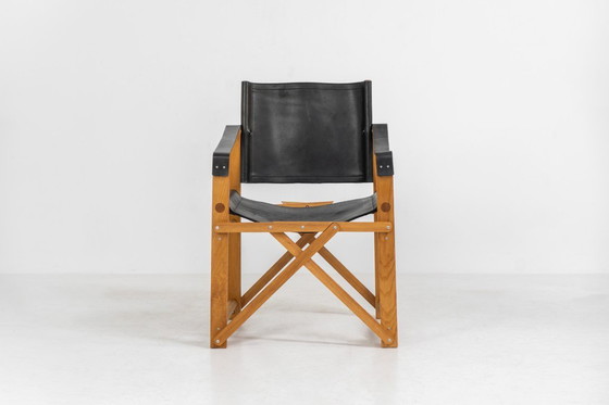 Een opvallende fauteuil uit de jaren 80, vervaardigd uit massief eikenhout en voorzien van een zwarte leren zitting en rugleuning. Het ontwerp kenmerkt zich door een stevig, architectonisch frame met zichtbare verbindingen en kruisverstevigingen, wat de stoel een robuuste maar verfijnde uitstraling geeft. De stoel is gemakkelijk inklapbaar, waardoor hij bij opslag ongeveer de helft minder ruimte inneemt.