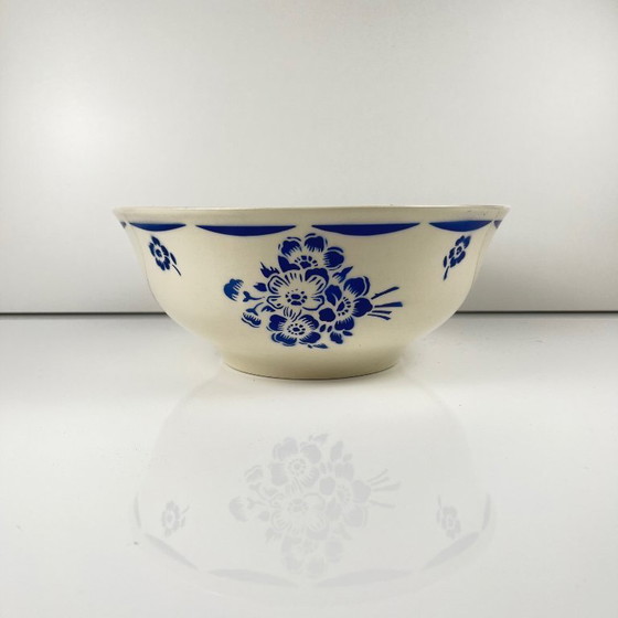Saladekom van halfporselein uit Badonviller, met blauw bloemenpatroon, begin 20e eeuw.