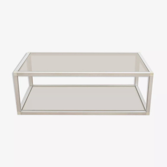 Salontafel van aluminium en rookglas, Frankrijk, circa 1980. Slijtage in overeenstemming met de leeftijd. Stevig en stabiel. Dubbele bladen.