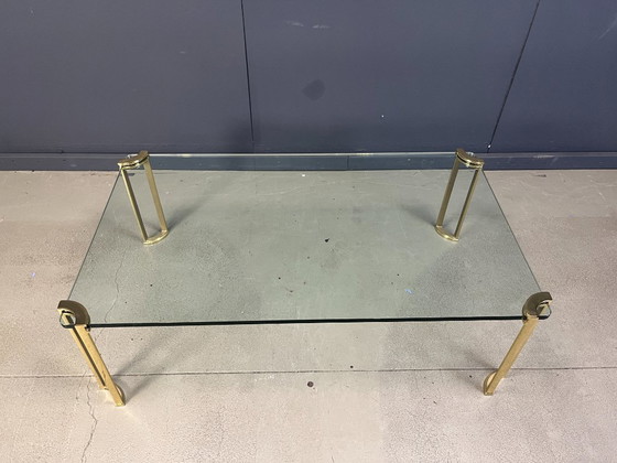 Vintage salontafel bestaande uit 4 massief messing poten die een helder glazen blad ondersteunen, in de stijl van Peter Ghyczy.
