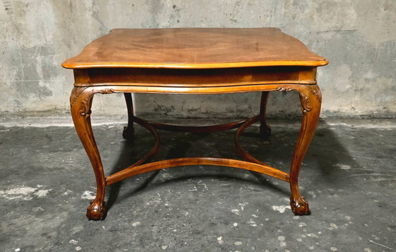 Het gevormde tafelblad is gefineerd met licht hout in geometrische panelen, omlijst door een sierlijst die de contouren van het blad volgt. De gebogen rand opent om twee geïntegreerde lades aan de zijkant te onthullen. De tafel rust op vier sierlijke cabriolepoten, verbonden door een gevormde dwarsbalk. De poten eindigen in klauwvoeten. Massief houten frame, decoratief fineerblad. Goede algehele staat, met een antieke patina en gebruikssporen die passen bij de leeftijd van het meubelstuk. Afmetingen: B 95 x D 95 x H 65 cm
