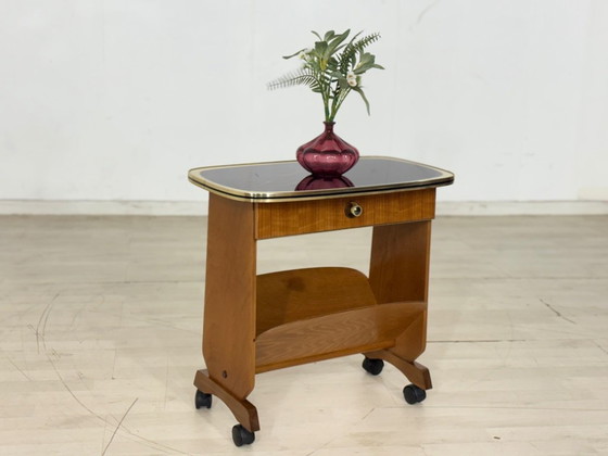 Te koop: een prachtige vintage salontafel/bijzettafel met plank en lade in goede staat. Het blad is van glas.