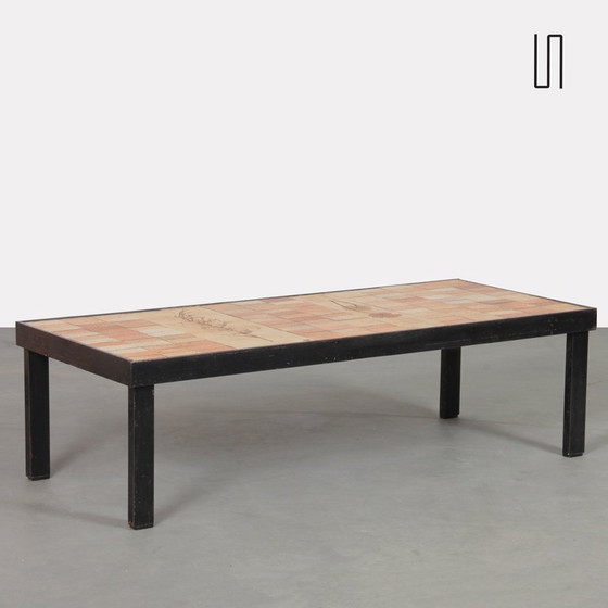 Deze salontafel is ontworpen door Roger Capron in de jaren 1960. Het blad is van geglazuurd keramiek met een herbariummotief en het frame is van metaal. D0644
