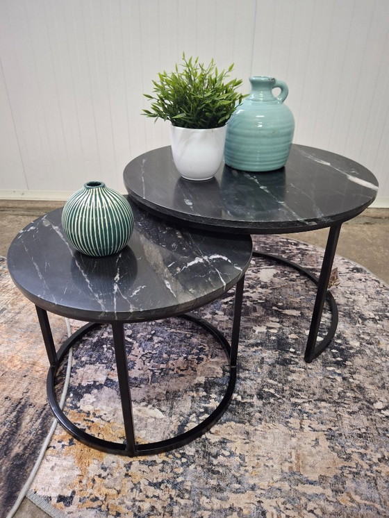 Mooie nieuwe salontafelset met echt marmer blad en metalen onderstel.