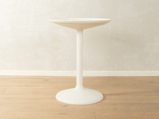 SÄNDSKAR bijzettafel uit de IKEA PS-collectie, ontworpen door Thomas Sandell. Het organische silhouet met de elegant gebogen tulpvormige voet en het ronde, afneembare tafelblad, dat ook als dienblad gebruikt kan worden, belichaamt een vloeiende, harmonieuze geometrie. Gemaakt van stevig wit kunststof, weerspiegelt het meubelstuk het innovatieve materiaalgebruik van zijn tijd. Een zorgvuldig gereinigde, tijdloze klassieker in goede vintage staat.