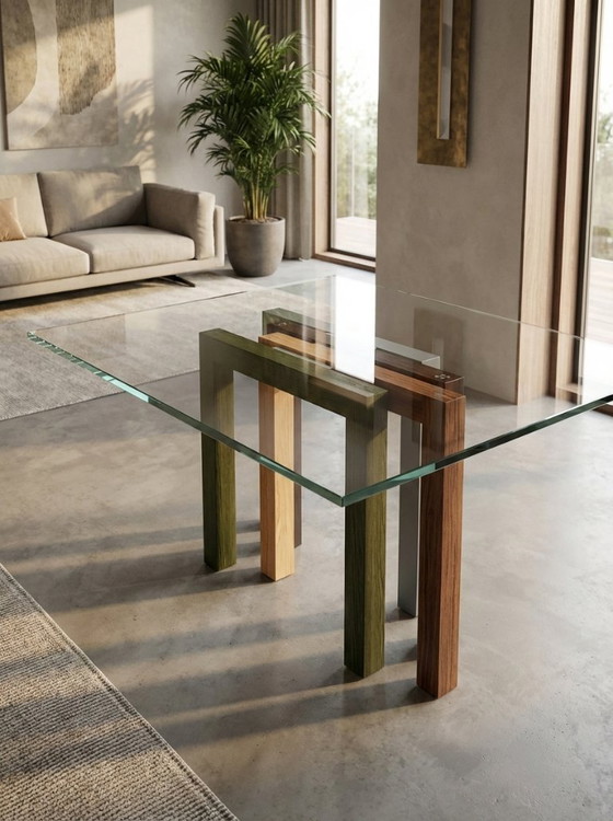 Vierkante tafel van het model Monos uit 1981, met een blad van 2 cm dik glas.